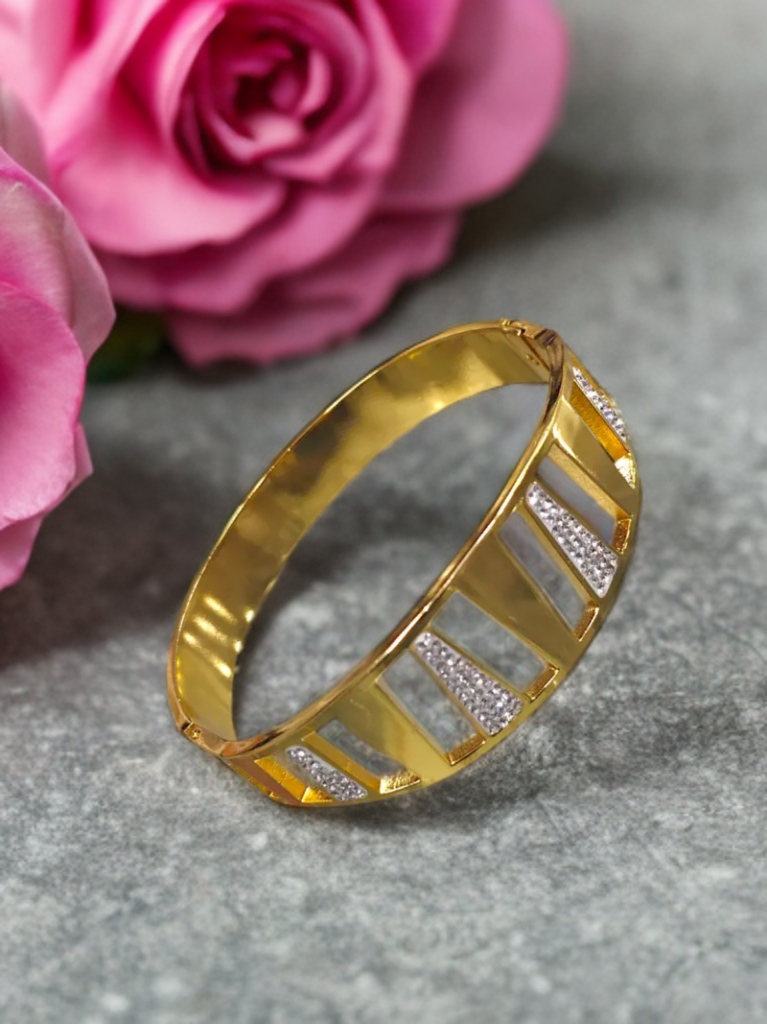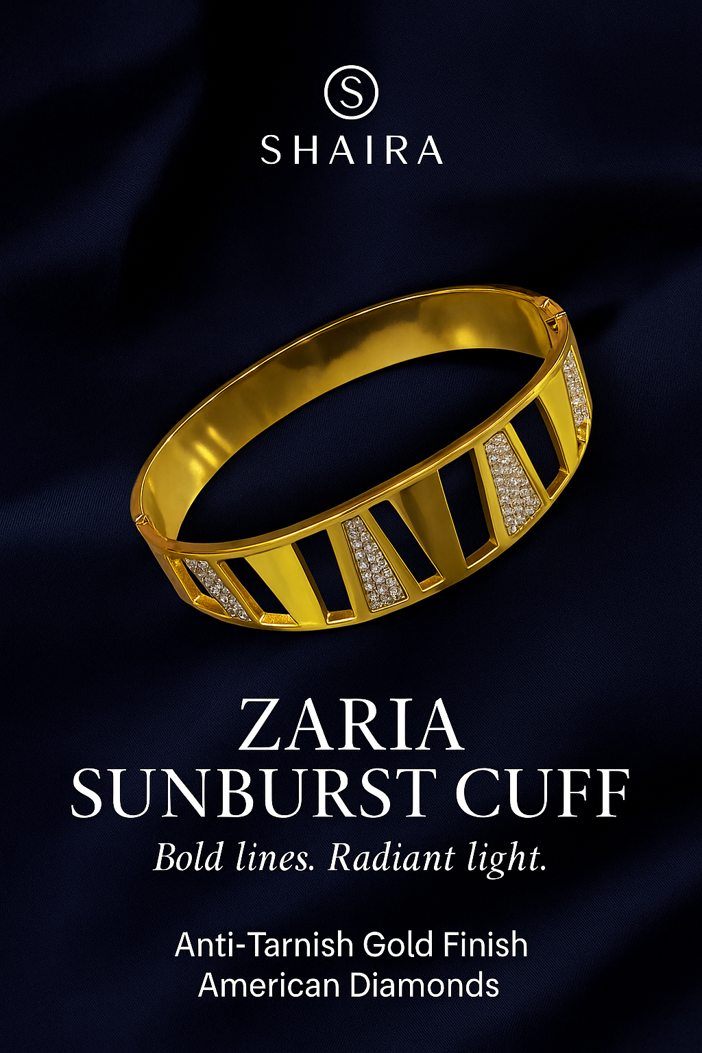Step into the spotlight with the Zaria Sunburst Cuff — a bold, radiant bracelet designed to dazzle. Crafted with a high-polish anti-tarnish gold finish and inset with shimmering American Diamonds, this statement cuff reflects confidence and grace. Ideal for festive occasions, weddings, or luxury gifting, it elevates any look with ease.